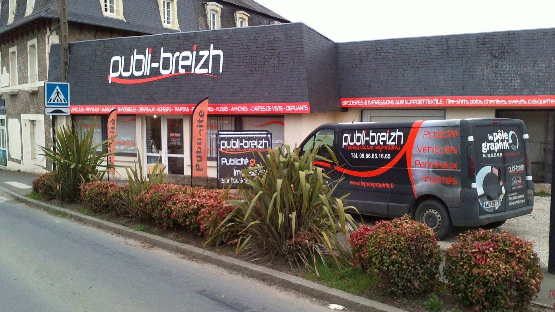 Depuis 2013 Publi-Breizh répond à vos besoins de publicité et d’impression sur tous supports.  De la création du logo à toute une charte graphique, de la carte de visite au brochure, du panneau au véhicule, du T-shirt à l’objet publicitaire, du décor des portes au totem, avec ou sans pose, nous réalisons pour vous la création et la fabrication de vos différents moyens de communication.