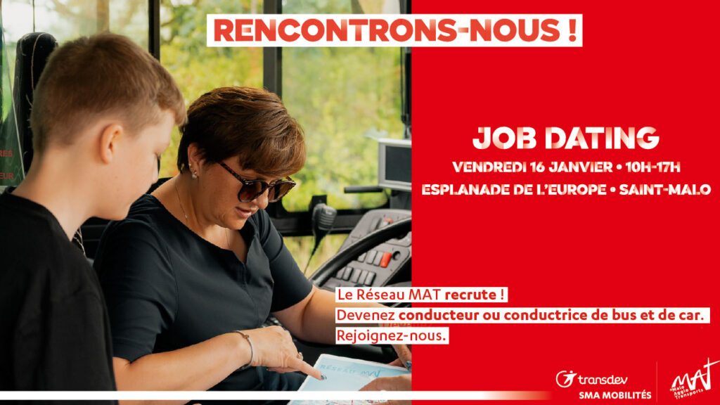 Transdev SMA Mobilités, opérateur du réseau MAT au sein de Saint-Malo Agglomération, lance une opération de recrutement dédiée aux conducteurs et conductrices de bus et de car. Une journée Job dating se tiendra vendredi 16 janvier 2026, de 10h à 17h, sur l’Esplanade de l’Europe à Saint-Malo.